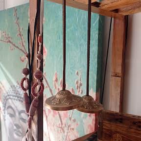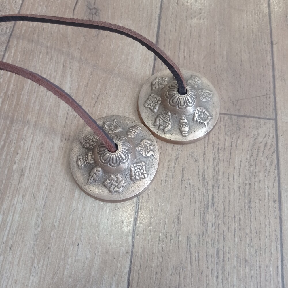 Tingshas tibetanas de bronce con grabados, para crear armonía, contra la ansiedad y el estres.